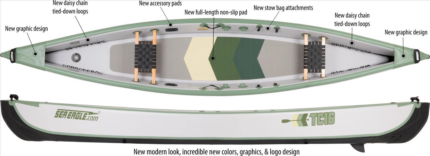 The New 2026 TC16 is a whopping 10 lbs. lighter & features a new modern look, incredible new colors, graphics, & logo design, bow & stern daisy-chain tie-down loops for securing gear, dual attachment points for side storage bags, dual Sea Eagle accessory pads for attaching a vast array of Yak-attack, Scotty, & similar accessories, & underside abrasion absorption strips to further protect the underside.