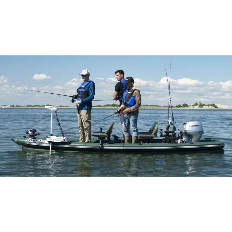 Thanks to advanced double-layer, all drop-stitch fusion technology, this next-generation FishSkiff™ weighs just 95 lbs, yet delivers the strength and rigidity of a traditional hard hull. The fusion-welded construction adds durability, an extra independent safety air chamber, and makes the boat easier than ever to roll, fold, and store.